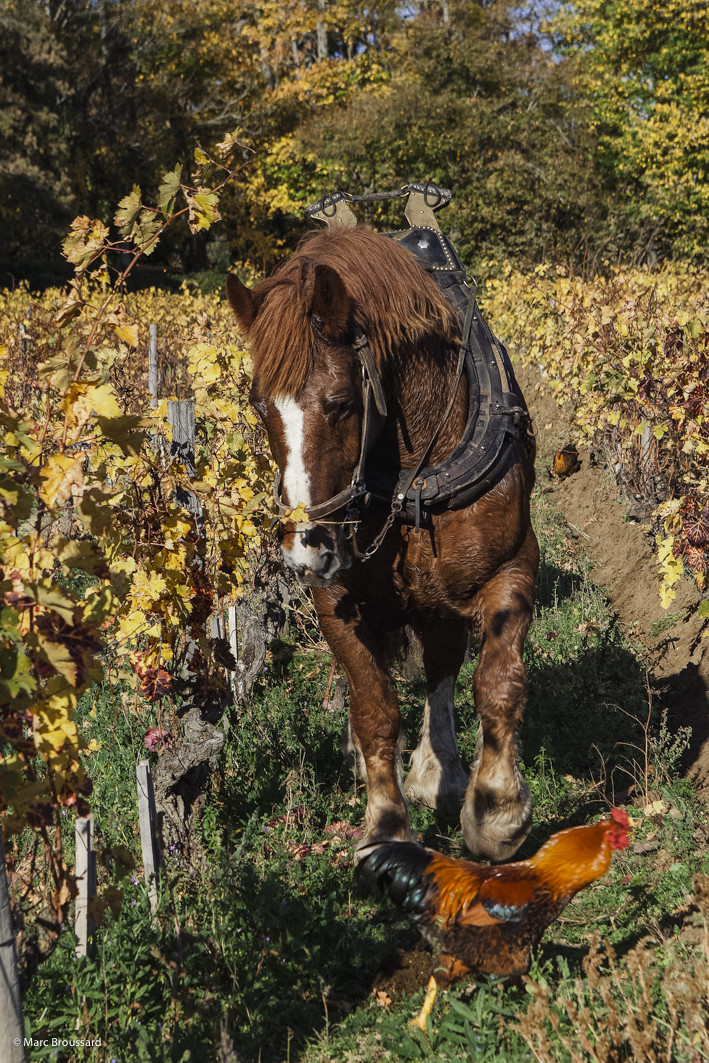 Fiona maakt maximaal gebruik van boerderijdieren om haar wijngaard in topconditie te houden. Zo gebruikt ze een paard om de bodem lichtjes mee te ploegen, maar vooral om onkruid te grazen wanneer dat té welig begint te tieren. Daarnaast zet ze kippen in voor hetzelfde doel: kleine plantjes uitgraven en opeten.
