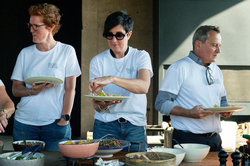 De weergoden waren ons goedgezind; onder een stralende blauwe lucht schoven we aan een lange tafel aan om te klinken op de oogst en te genieten van nog een heerlijke BBQ met Valke Vleug wijnen en andere Vinetiq wijnen!