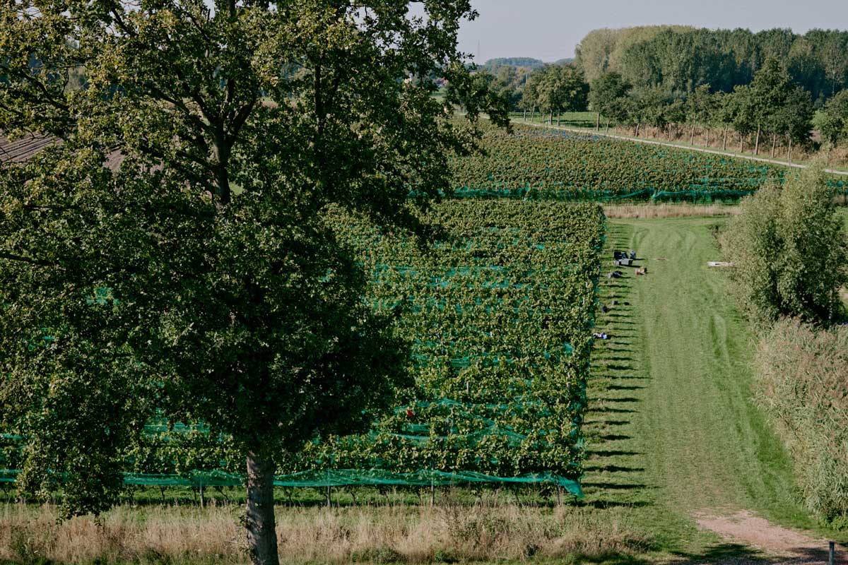 Eens we de voorjaarvorst overleefd hadden en de meteorologen een warme en droge zomer voorspelden, maakten we ons klaar om er stevig tegenaan te gaan. Door een vorstloze maand mei konden we vroeg beginnen met het uitdunnen van de scheuten. We willen de opbrengst immers beperken om de kwaliteit te verbeteren. Enkele weken later, tijdens het opbinden van de scheuten, werden we vervoegd door een team van “Den Atelier”, een arbeidszorgcentrum te Niel die mensen met een afstand tot de arbeidsmarkt begeleidt en ondersteunt.